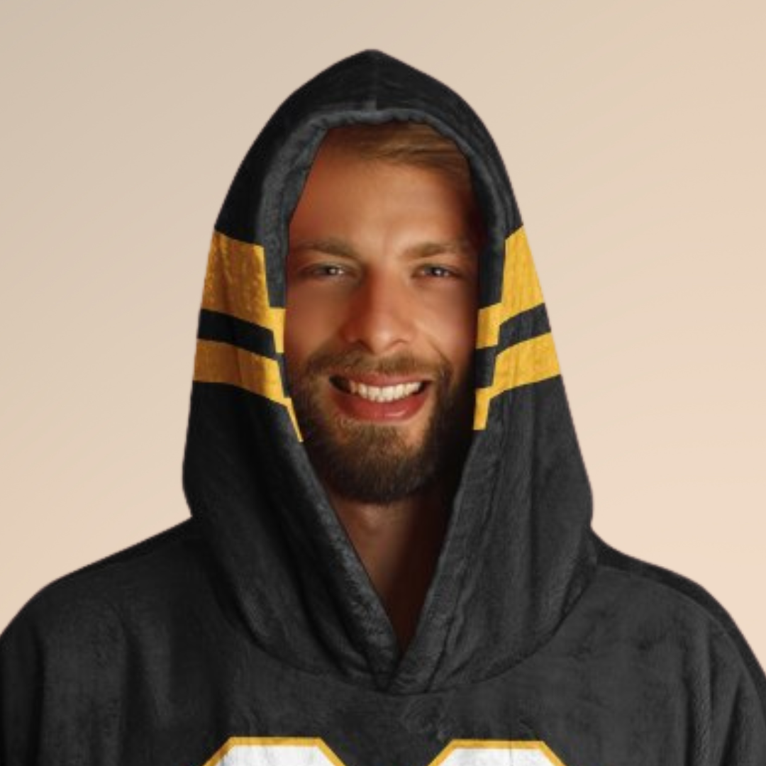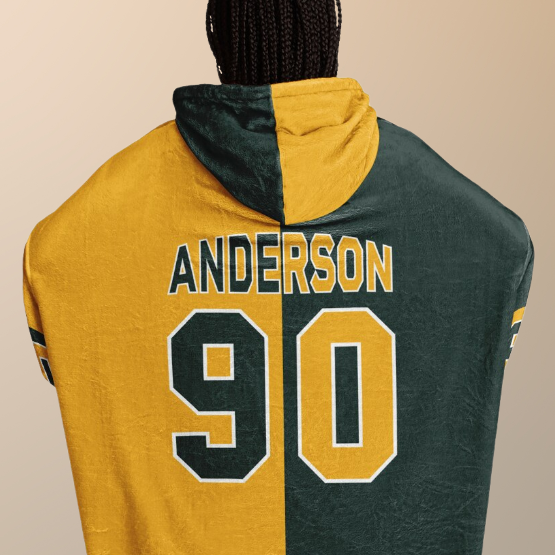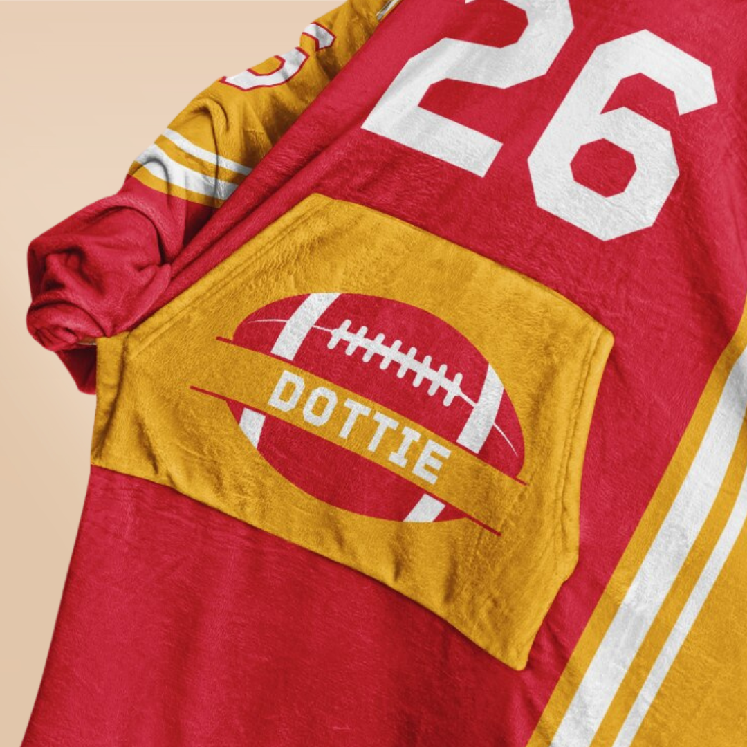It’s a premium, wearable blanket hoodie — thick, cozy, and designed in team-inspired colors so you can stay warm and stylish all game long.