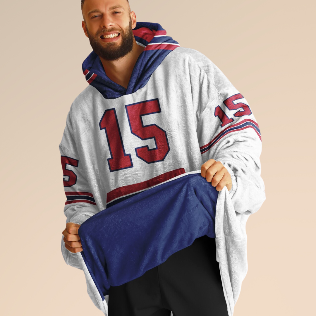 It’s a premium, wearable blanket hoodie — thick, cozy, and designed in team-inspired colors so you can stay warm and stylish all game long.