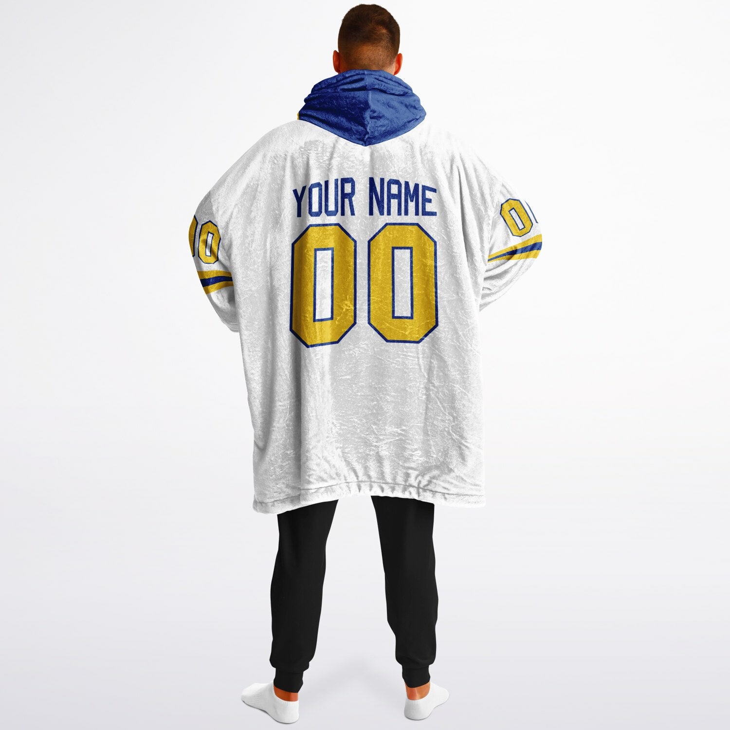 It’s a premium, wearable blanket hoodie — thick, cozy, and designed in team-inspired colors so you can stay warm and stylish all game long.