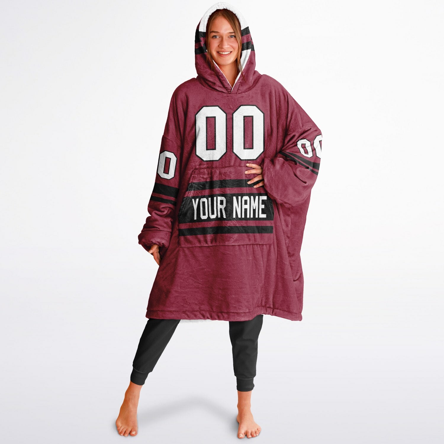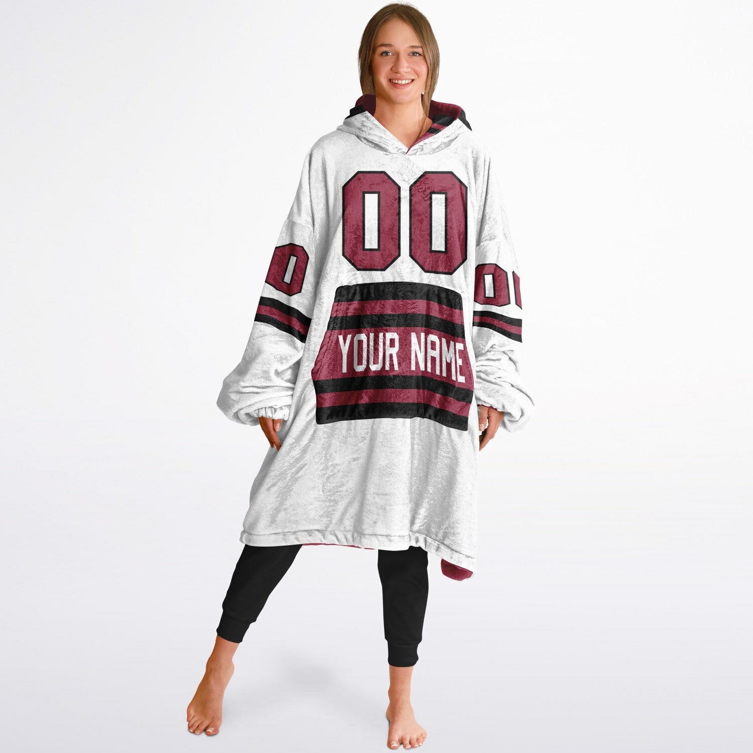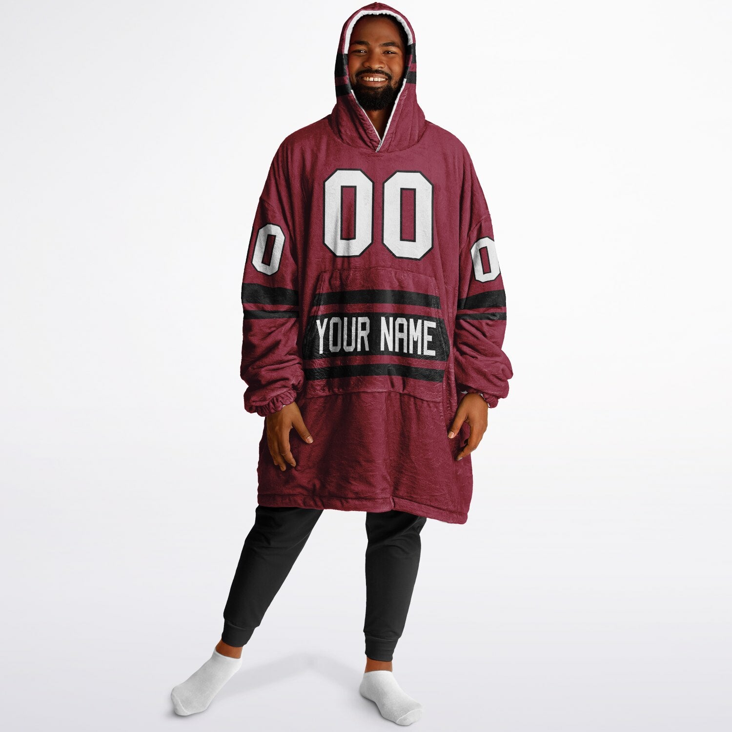 Show up for your team — and your comfort — with the Superfan Reversible Snug Hoodie. Inspired by classic home-and-away jersey colors, this double-sided design gives you two bold looks in one ultra-thick, blanket-weight hoodie. One side brings that home-field energy with eye-catching cardinal red and black hues; flip it inside out for a fresh, lighter colorway that feels just as spirited. Add your personalized name and number to make it your own, and you’ve got the ultimate fan essential for game days, snow days, and every lazy day in between.